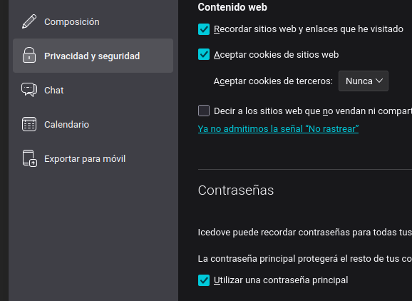 Settings > Privacy and security > Password > Use main password (translated from Spanish).
